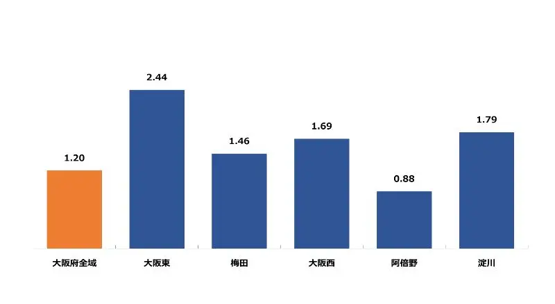 大阪府の8月の地域別有効求人倍率は、大阪東が最も高く2.44倍、それ以外の地域でも(阿倍野を除く)1倍を超える有効求人倍率となっております。