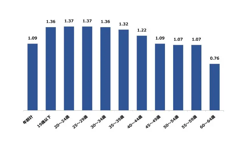 大阪府の9月の年齢別有効求人倍率は、20~24歳、25〜29歳が最も高く1.37倍、次いで、19歳以下、30〜34歳が1.36倍となっております。