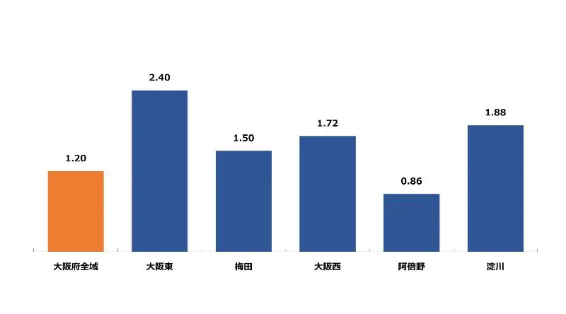 大阪府の9月の地域別有効求人倍率は、大阪東が最も高く2.40倍、それ以外の地域でも(阿倍野を除く)1倍を超える有効求人倍率となっております。