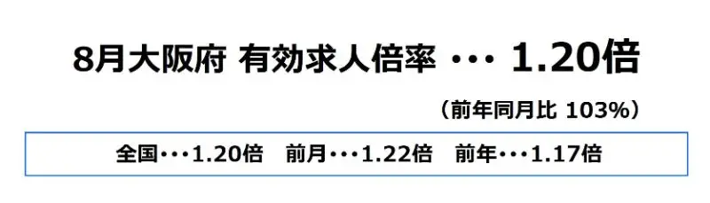 大阪府の8月の有効求人倍率は、1.20倍となり、前月より0.02ポイント下降、前年同月比では103%となっております。