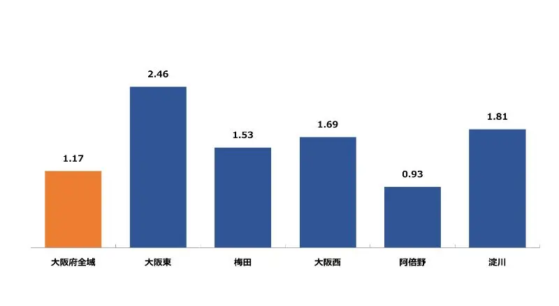 大阪府の11月の地域別有効求人倍率は、大阪東が最も高く2.46倍、それ以外の地域でも(阿倍野を除く)1倍を超える有効求人倍率となっております。