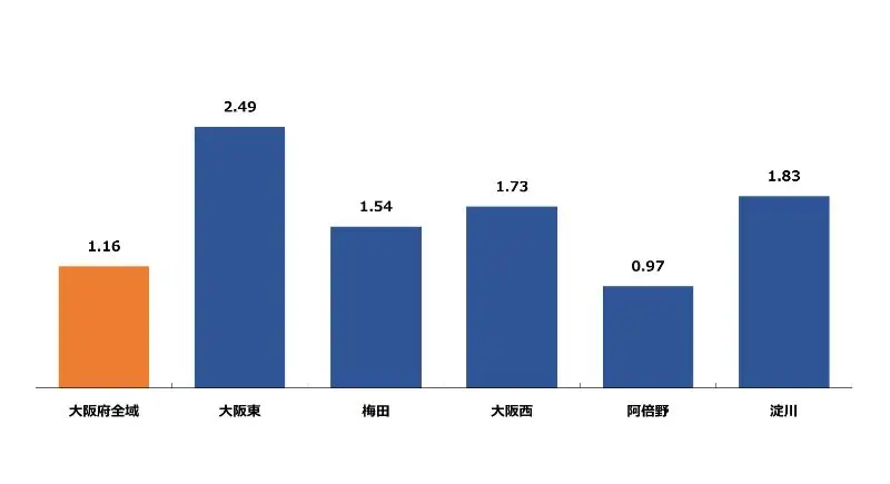 大阪府の12月の地域別有効求人倍率は、大阪東が最も高く2.49倍、それ以外の地域でも(阿倍野を除く)1倍を超える有効求人倍率となっております。