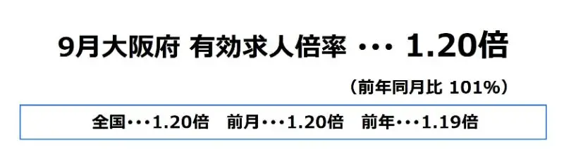 大阪府の9月の有効求人倍率は、1.20倍となり、前月と同水準、前年同月比では101%となっております。