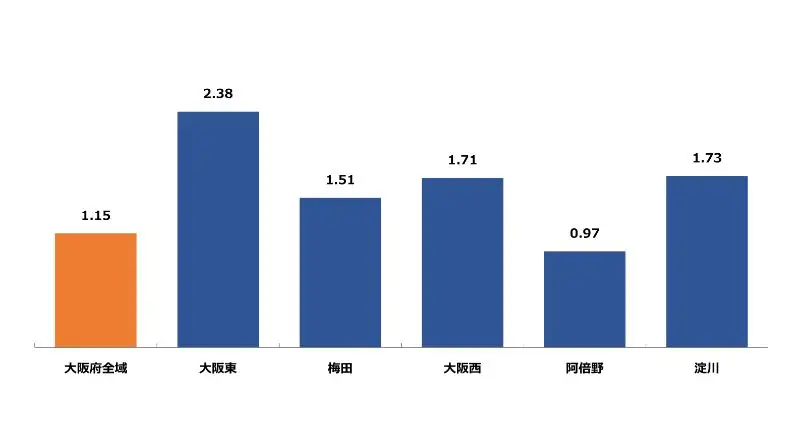 大阪府の1月の地域別有効求人倍率は、大阪東が最も高く2.38倍、それ以外の地域でも(阿倍野を除く)1倍を超える有効求人倍率となっております。