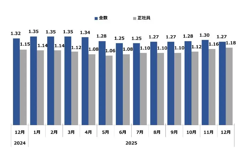求職者1人に対する求人件数。倍率が1を超えるということは、求職者数よりも求人件数が多い(=採用難)ということを表します。