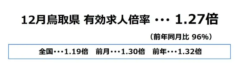 鳥取県の12月の有効求人倍率は、1.27倍となり、前月より0.03ポイント下降、前年同月比では96%となっております。