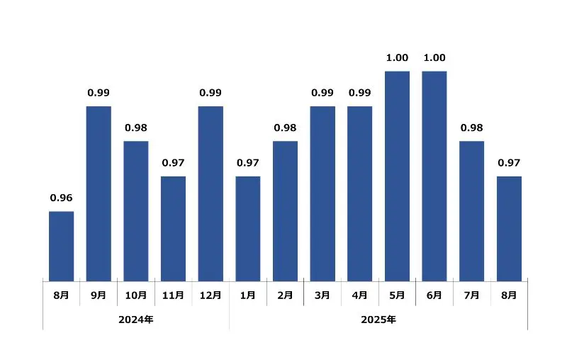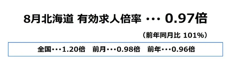 北海道の8月の有効求人倍率は0.97倍となり、前月より0.01ポイント下降、前年同月比では101%となっております。