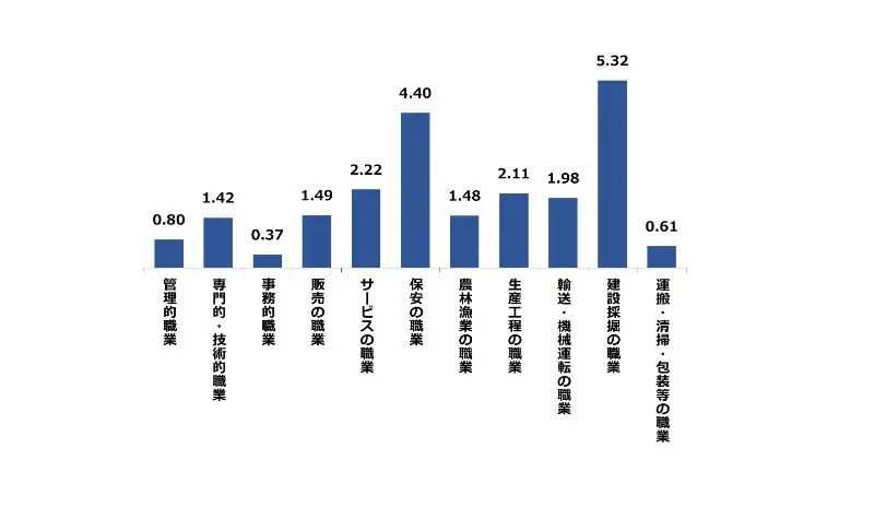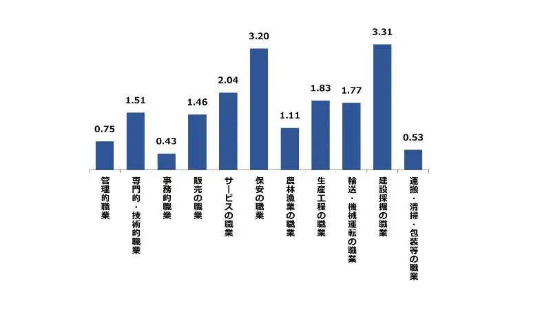求職者1人に対する求人件数。倍率が1を超えるということは、求職者数よりも求人件数が多い(=採用難)ということを表します。