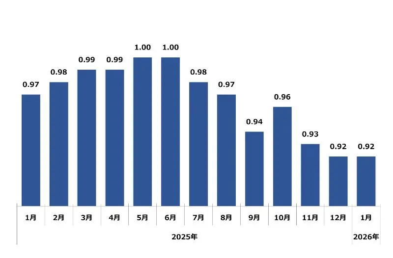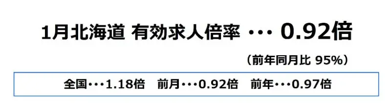 北海道の1月の有効求人倍率は0.92倍となり、前月と同水準、前年同月比では95%となっております。