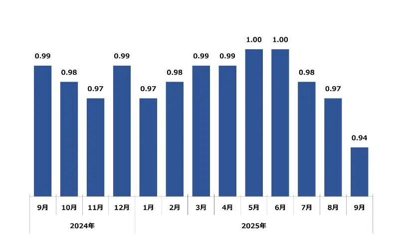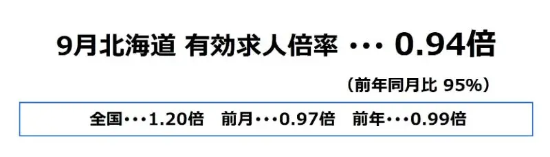 北海道の9月の有効求人倍率は0.94倍となり、前月より0.03ポイント下降、前年同月比では95%となっております。