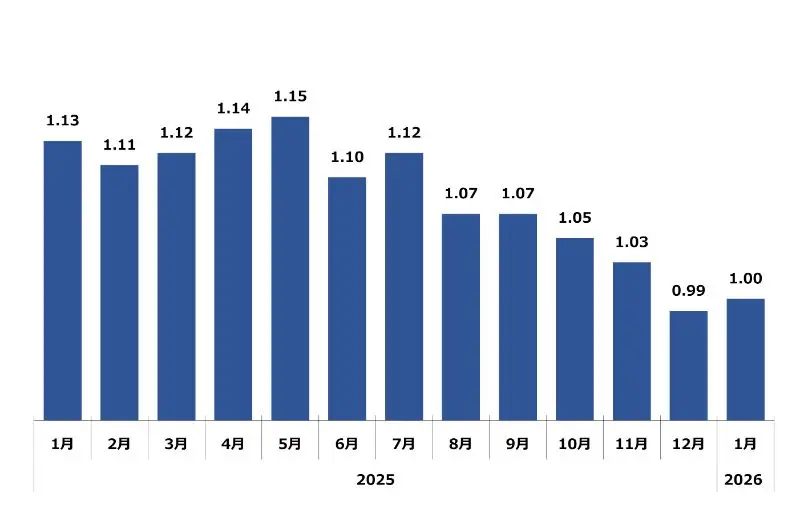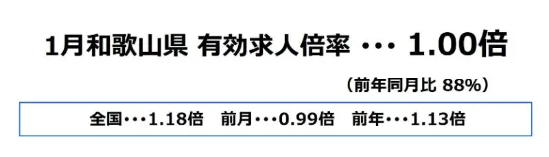 和歌山県の1月の有効求人倍率は、1.00倍となり、前月より0.01ポイント上昇、前年同月比では88%となっております。