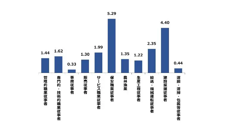 和歌山県の1月の職種別有効求人倍率は、保安職業従事者が最も高く5.29倍、建設採掘従事者が4.40倍となっております。