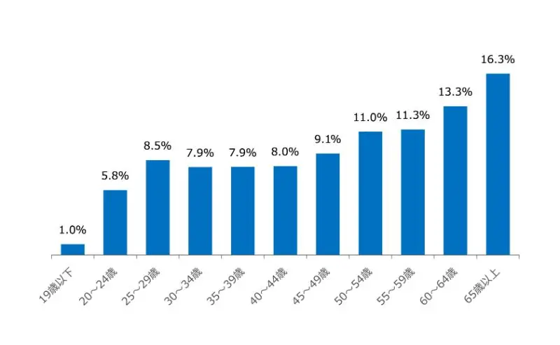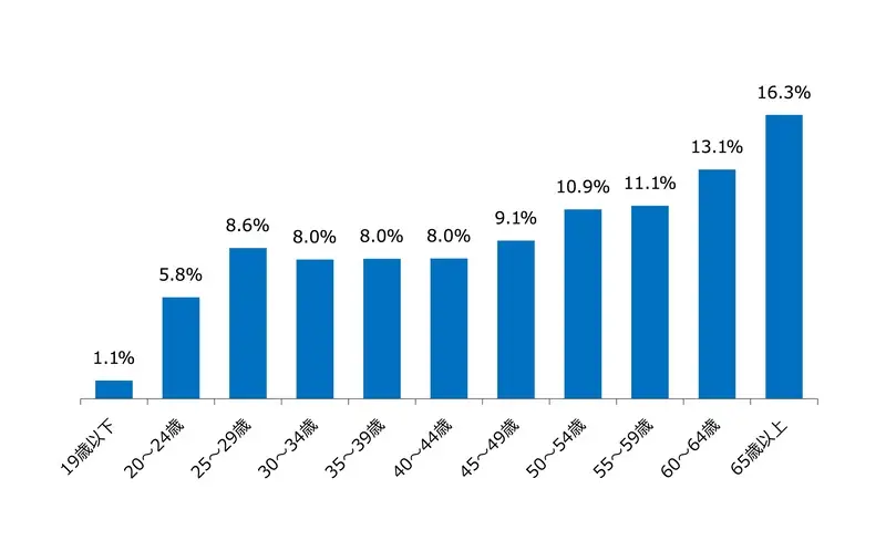 上のグラフは、静岡県内の求職者を年齢別にし、構成比をまとめたものです。50代以上が全体の5割近くを占めていることから、10代~30代前半までの若年層は、求職者数が少なく、採用が難しい傾向にあることがわかります。30代後半・40代となるにつれ、採用難易度が下がっていきます。