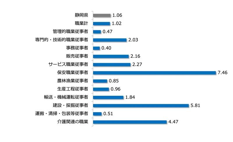 また、中高年層を対象にした求人が多い、運搬・清掃・包装等の職業も低い倍率なのが見て取れます。逆に、静岡県で求人数が多い保安・建設・採掘は高い倍率を示しており、次いで介護関連の職種も比較的高い倍率で、採用難であることがみてとれます。