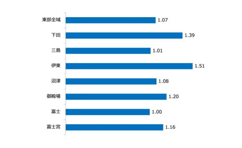 上のグラフは、静岡県東部のエリア別に有効求人倍率をまとめたものになります。
