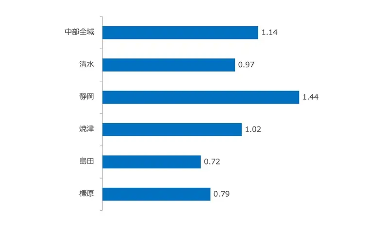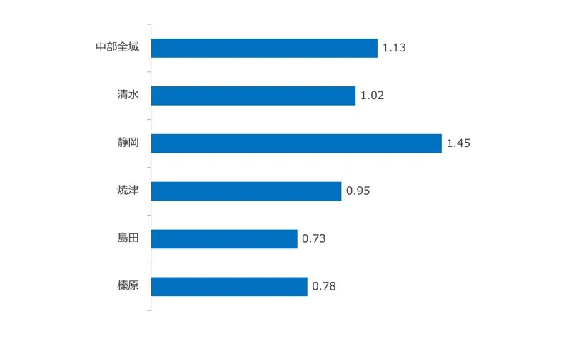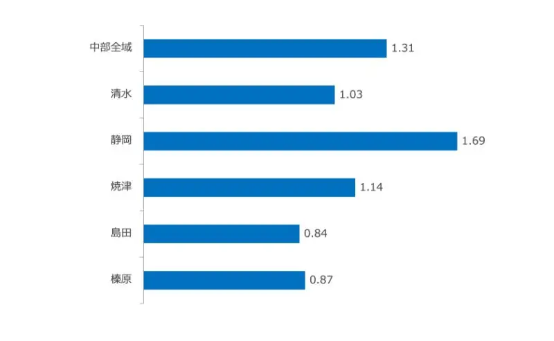 上のグラフは、静岡県中部のエリア別に有効求人倍率をまとめたものになります。静岡エリアは、比較的高い数値が出ています。反対に島田・榛原エリアは、比較的低い傾向があります。