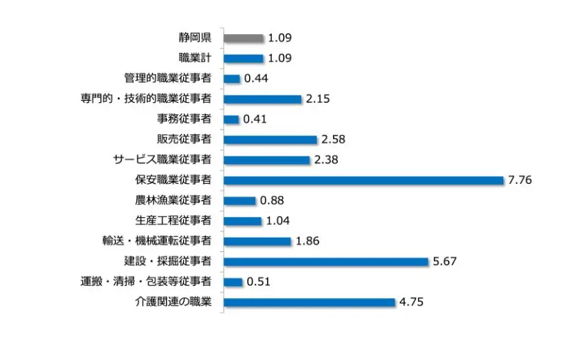 最後に、上のグラフは静岡県内の求人職種別に、有効求人倍率をまとめたものです。人気が高いものの求人数が少ない事務職は、非常に低い求人倍率となっております。