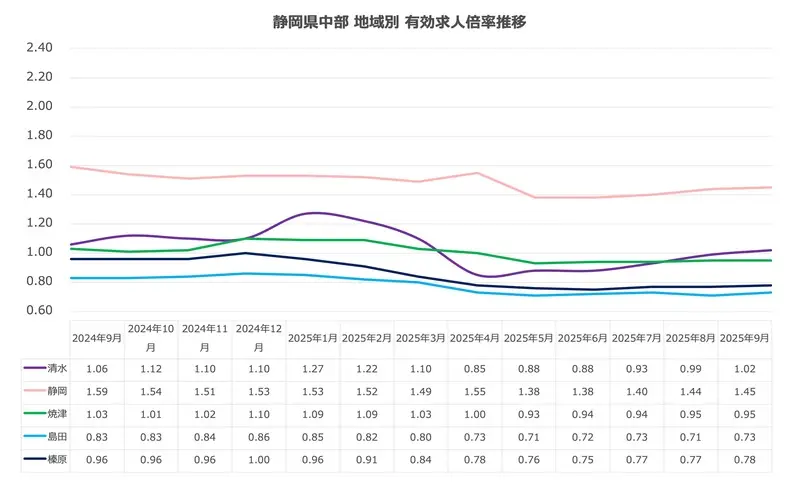 2025年11月更新|静岡県中部の有効求人倍率|エリア別、職種別、年齢別で採用市場が分かる!