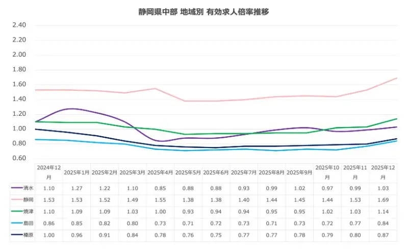 2026年2月更新|静岡県中部の有効求人倍率|エリア別、職種別、年齢別で採用市場が分かる!