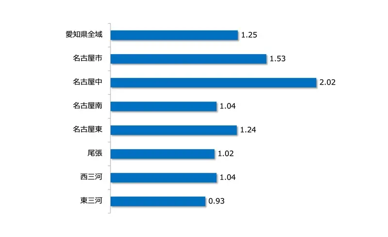 ◎名古屋市1.53倍、尾張エリア1.02倍、西三河1.04倍、東三河0.93倍となり、西三河エリア・東三河エリアは前月を上回った。