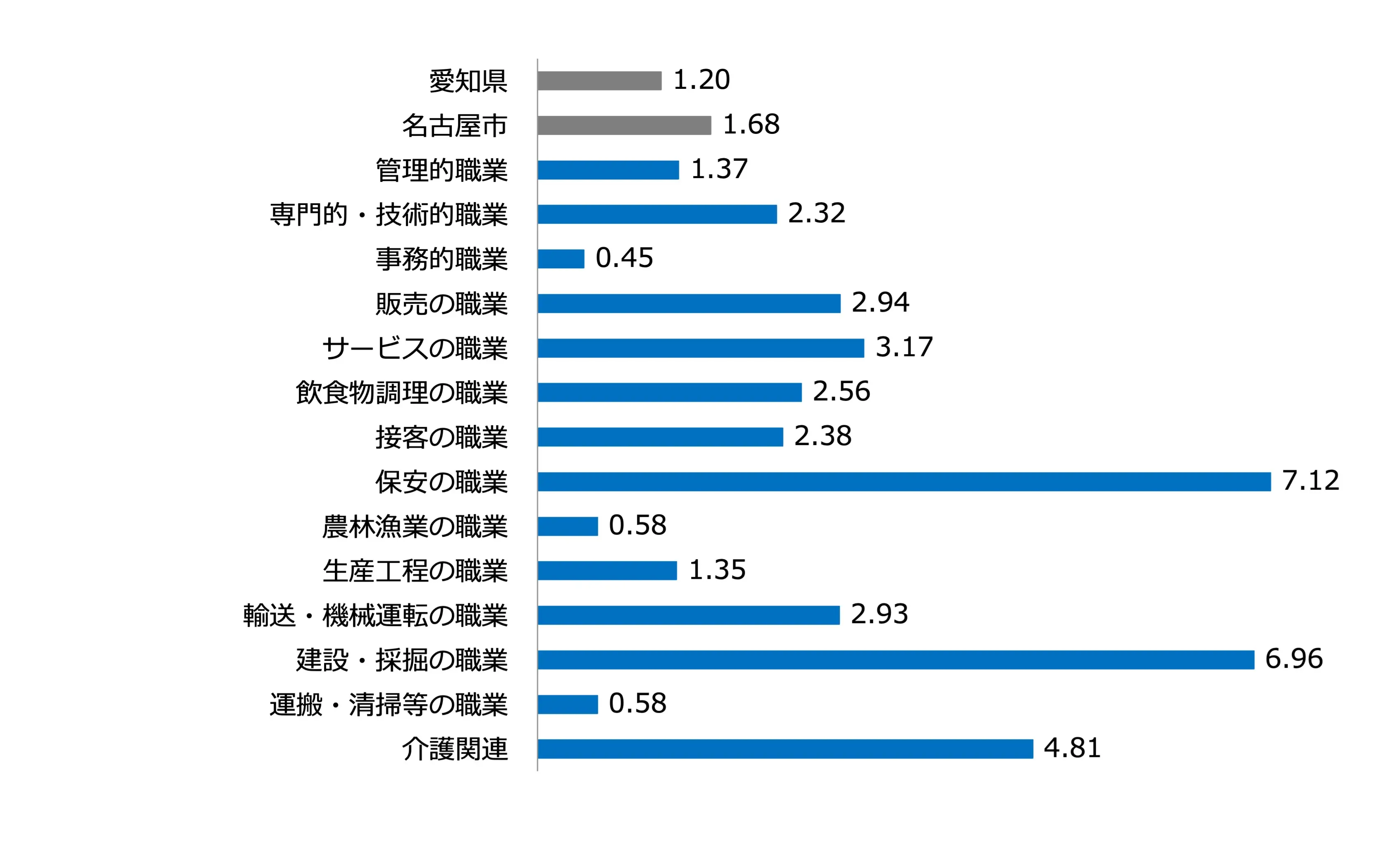 最後に、上のグラフは愛知県内の求人職種別に、有効求人倍率をまとめたものです。人気が高いものの求人数が少ない事務職は、非常に低い求人倍率となっております。