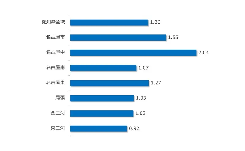 ◎名古屋市1.55倍、尾張エリア1.03倍、西三河1.02倍、東三河0.92倍となり、尾張エリア・西三河エリアは前月を上回った。