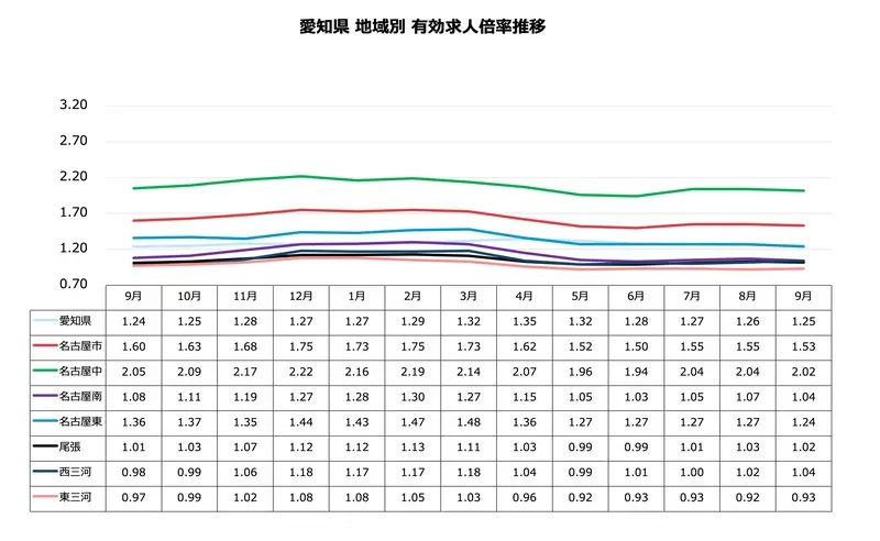 2025年9月の愛知県の有効求人倍率は、1.25倍と前月より下回りました。名古屋市全体の有効求人倍率は1.53倍、名古屋中心部は2.02倍となっており、名古屋市全体と中心部はどちらも前月より下回っております。