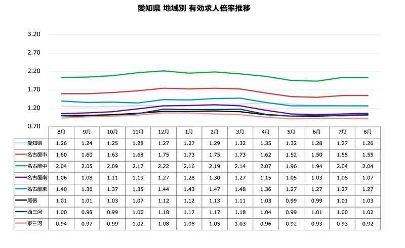 2025年8月の愛知県の有効求人倍率は、1.26倍と前月より下回りました。名古屋市全体の有効求人倍率は1.55倍、名古屋中心部は2.04倍となっており、名古屋市全体と中心部はどちらも前月と同水準となっております。