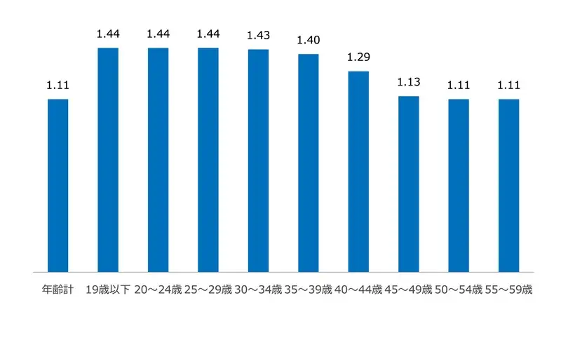 上のグラフは、愛知県内の求職者を年齢別にし、有効求人倍率をまとめたものです。10代~30代までは、有効求人倍率が1.40倍以上と採用が難しい現状です。40~50代の中高年層になるにつれて、採用難易度が下がっていきます。