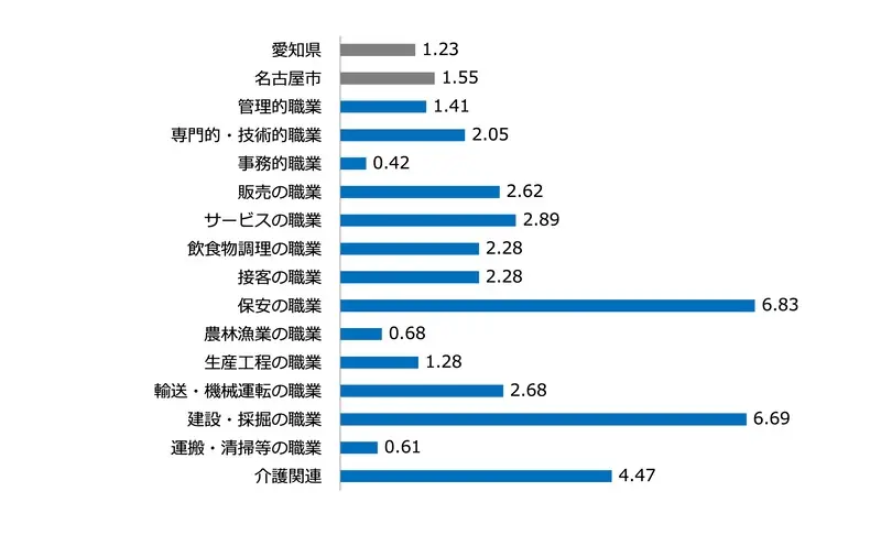 接客・飲食調理・販売・サービスといった今後も名古屋を中心に人材が必要になってくる職種、建設・介護等の資格等が必要になる職種はかなり高い倍率を示しており、採用難であることが顕著にみてとれます。