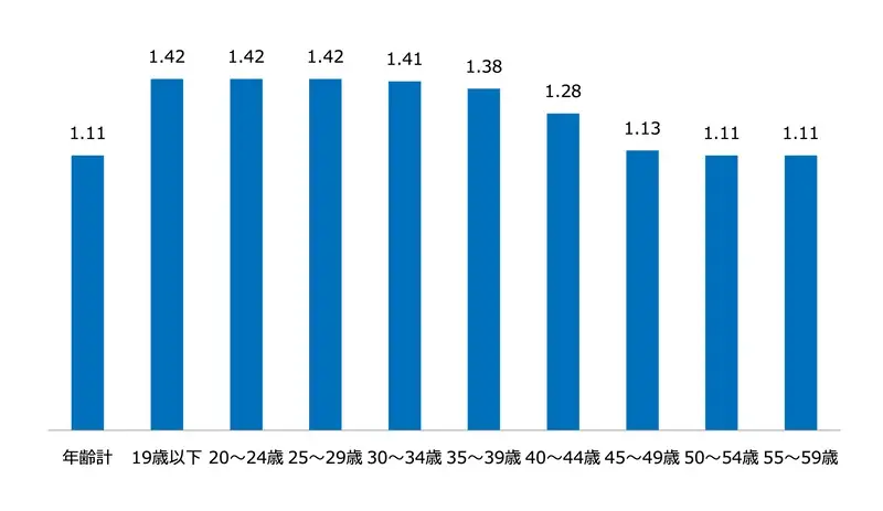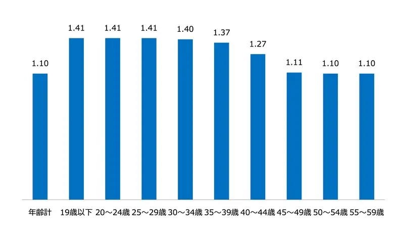 上のグラフは、愛知県内の求職者を年齢別にし、有効求人倍率をまとめたものです。10代~30代前半までは、有効求人倍率が1.40倍以上と採用が難しい現状です。40~50代の中高年層になるにつれて、採用難易度が下がっていきます。