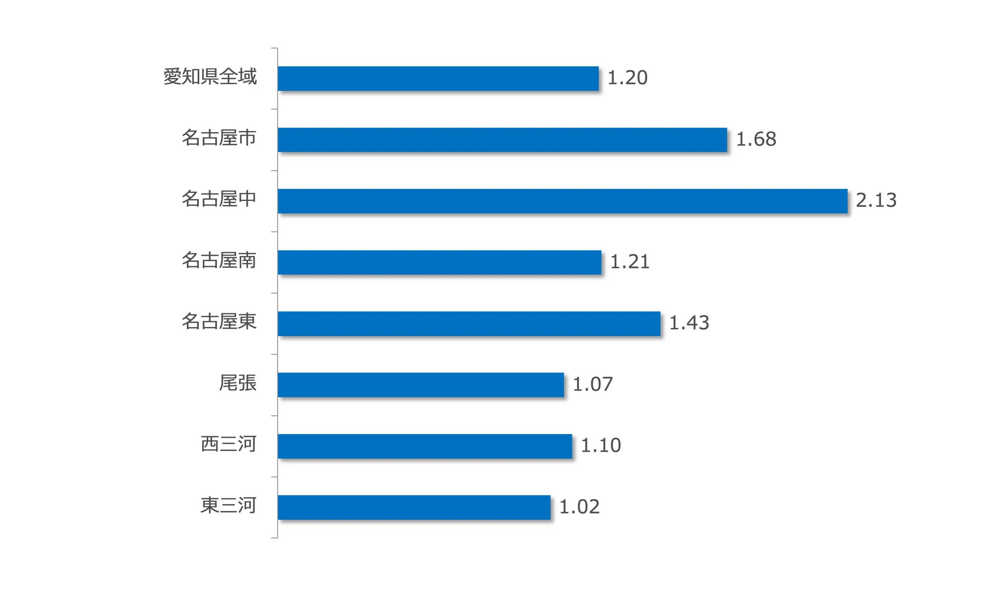 上のグラフは、愛知県のエリア別に有効求人倍率をまとめたものになります。名古屋市中心部が最も高く、それ以外の尾張、西三河、東三河は低い傾向にあります。