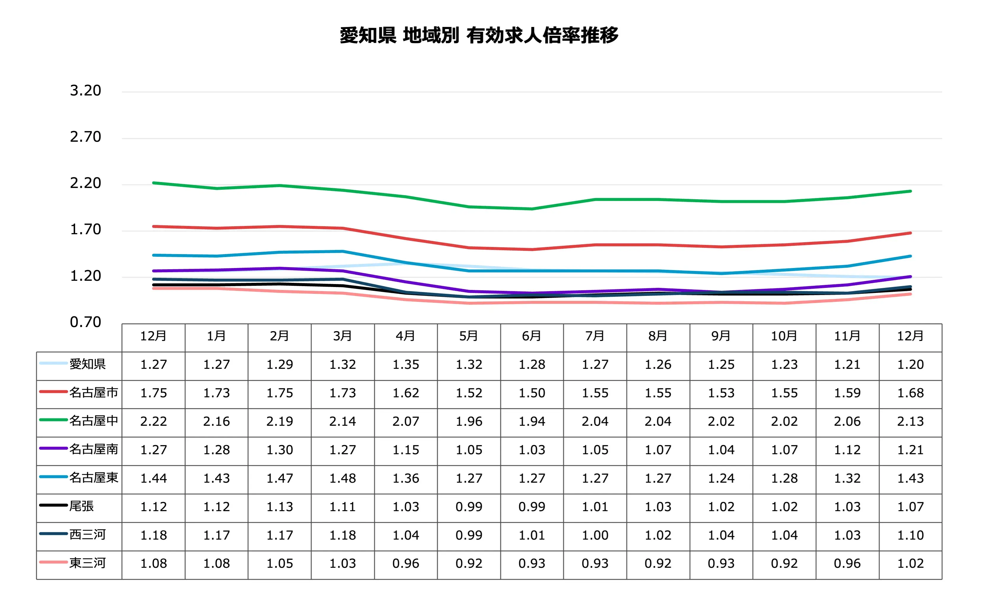 2025年12月の愛知県の有効求人倍率は、1.20倍と前月より下回りました。名古屋市全体の有効求人倍率は1.68倍、名古屋中心部は2.13倍となっており、名古屋市全体・中心部ともに前月より上回っております。