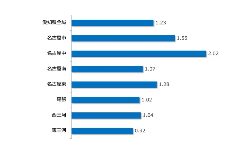 ◎名古屋市1.55倍、尾張エリア1.02倍、西三河1.04倍、東三河0.92倍となり、名古屋市エリアは前月を上回った。