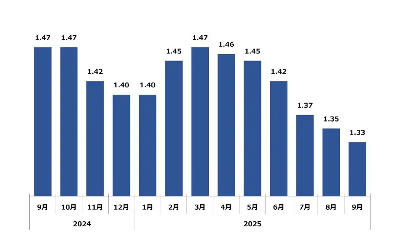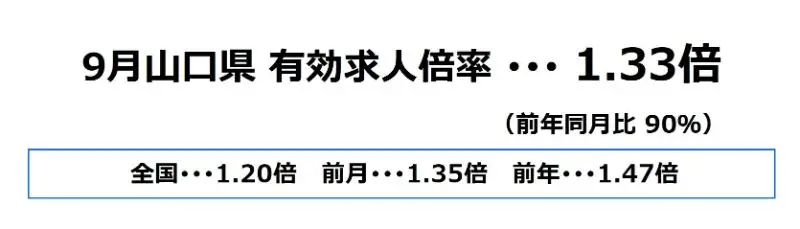 山口県の9月の有効求人倍率は、1.33倍となり、前月より0.02ポイント下降、前年同月比では90%となっております。