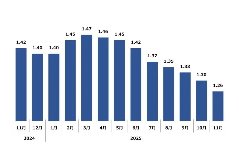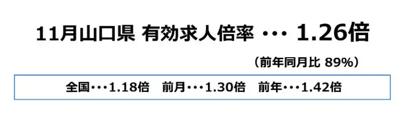 山口県の11月の有効求人倍率は、1.26倍となり、前月より0.04ポイント下降、前年同月比では89%となっております。