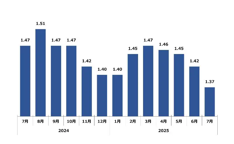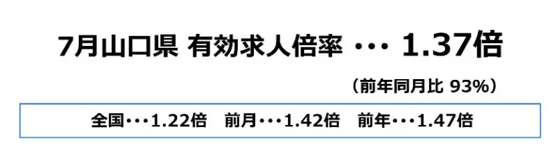 山口県の7月の有効求人倍率は、1.37倍となり、前月より0.05ポイント下降、前年同月比では93%となっております。