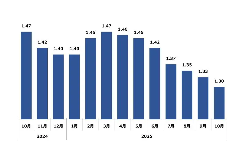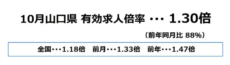 山口県の10月の有効求人倍率は、1.30倍となり、前月より0.03ポイント下降、前年同月比では88%となっております。