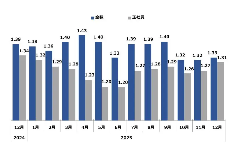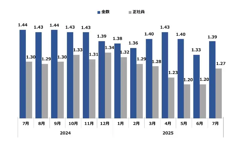 求職者1人に対する求人件数。倍率が1を超えるということは、求職者数よりも求人件数が多い(=採用難)ということを表します。