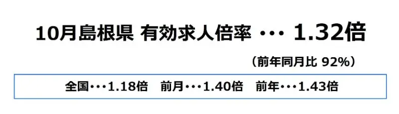 島根県の10月の有効求人倍率は、1.32倍となり、前月より0.08ポイント下降、前年同月比では92%となっております。