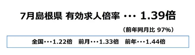 島根県の7月の有効求人倍率は、1.39倍となり、前月より0.06ポイント上昇、前年同月比では97%となっております。