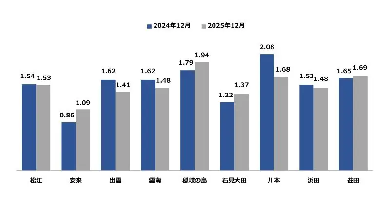 2026年2月現在、島根労働局からリリースされている2025年12月度の有効求人倍率データをまとめました。