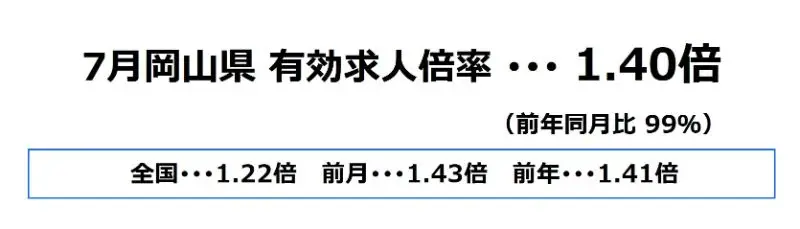 岡山県の7月の有効求人倍率は、1.40倍となり、前月より0.03ポイント下降、前年同月比では99%となっております。