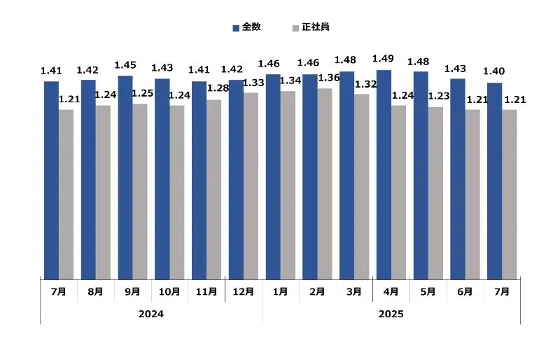 求職者1人に対する求人件数。倍率が1を超えるということは、求職者数よりも求人件数が多い(=採用難)ということを表します。