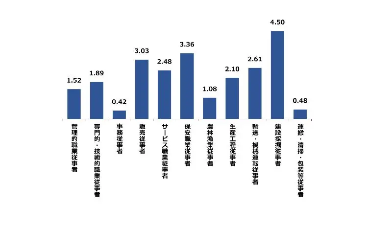 岡山県の7月の職種別有効求人倍率は、建設採掘従事者が4.50倍、次いで保安職業従事者が3.36倍と高くなっております。
