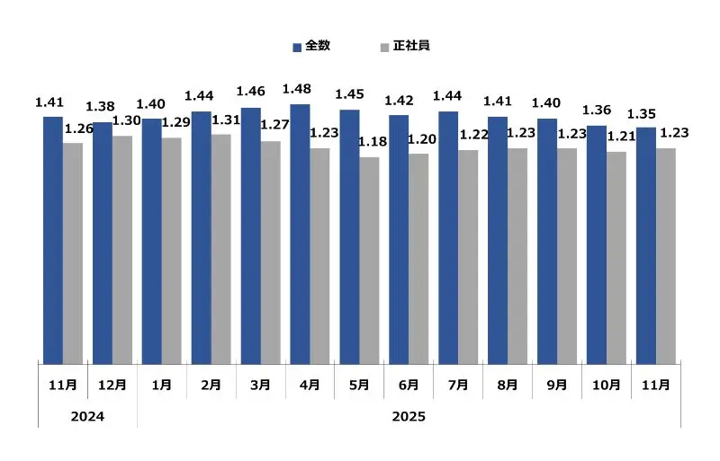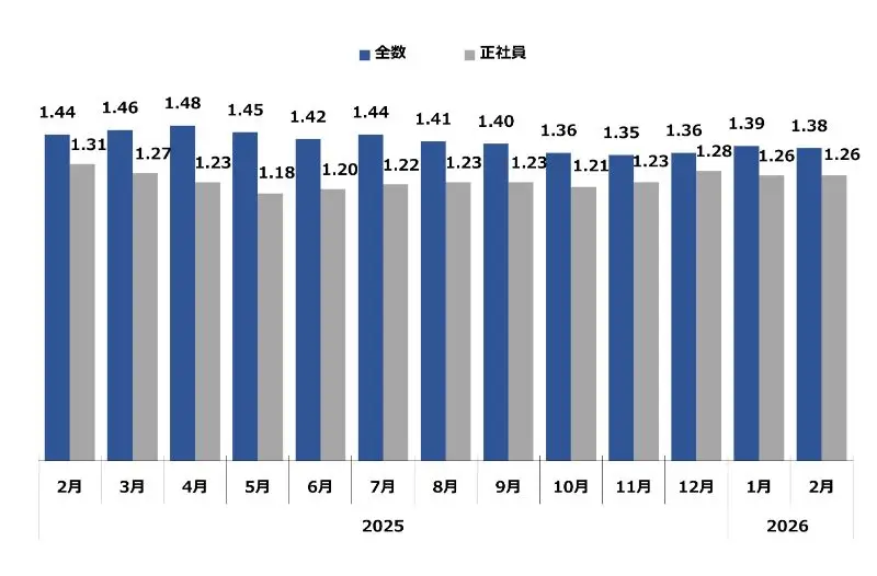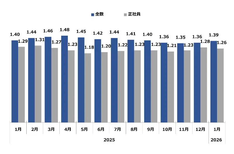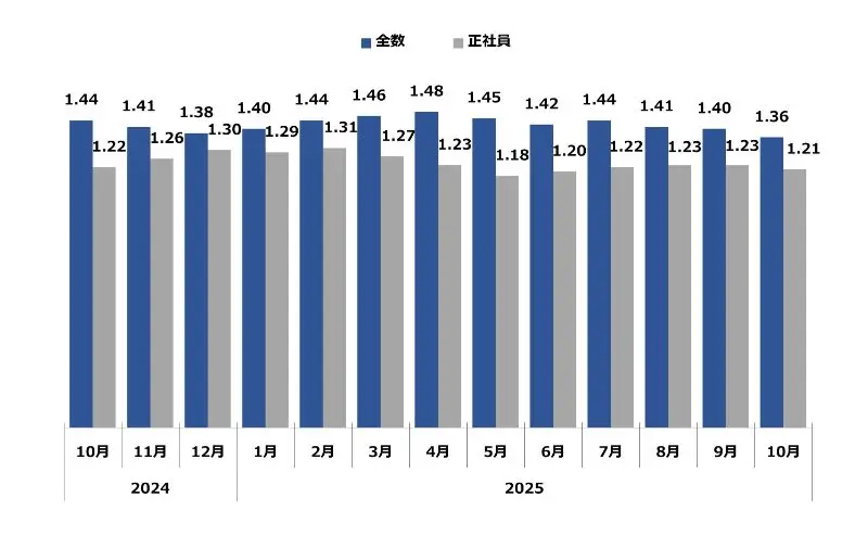 求職者1人に対する求人件数。倍率が1を超えるということは、求職者数よりも求人件数が多い(=採用難)ということを表します。
