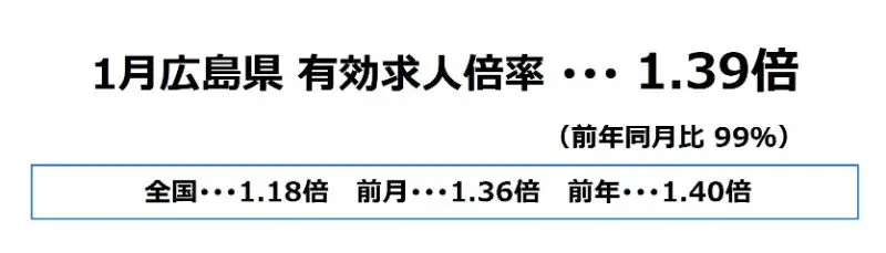 広島県の1月の有効求人倍率は、1.39倍となり、前月より0.03ポイント上昇、前年同月比では99%となっております。