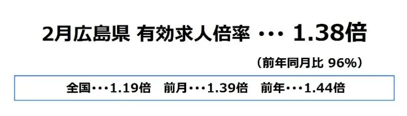 広島県の2月の有効求人倍率は、1.38倍となり、前月より0.01ポイント下降、前年同月比では96%となっております。