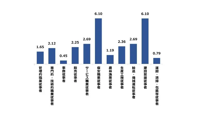 広島県の10月の職種別有効求人倍率は、建設採掘従事者、保安職業従事者が6.10倍と高くなっております。