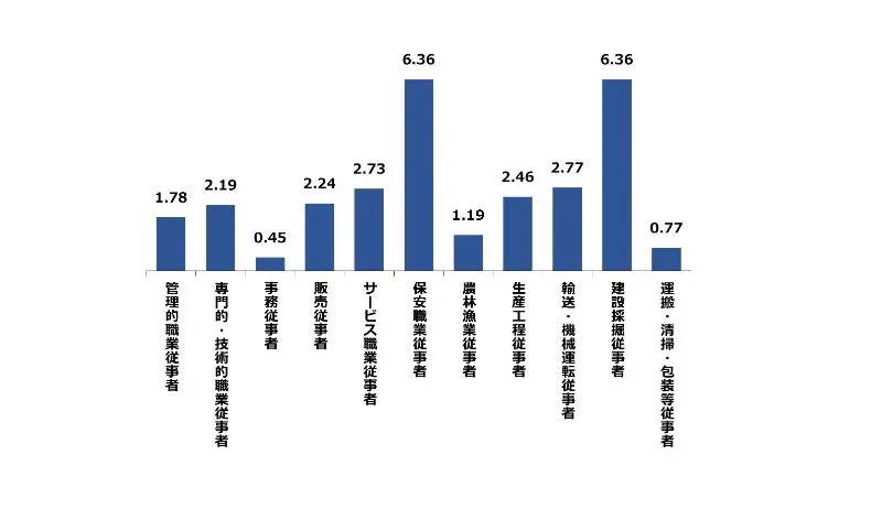 広島県の11月の職種別有効求人倍率は、建設採掘従事者、保安職業従事者が6.36倍と高くなっております。